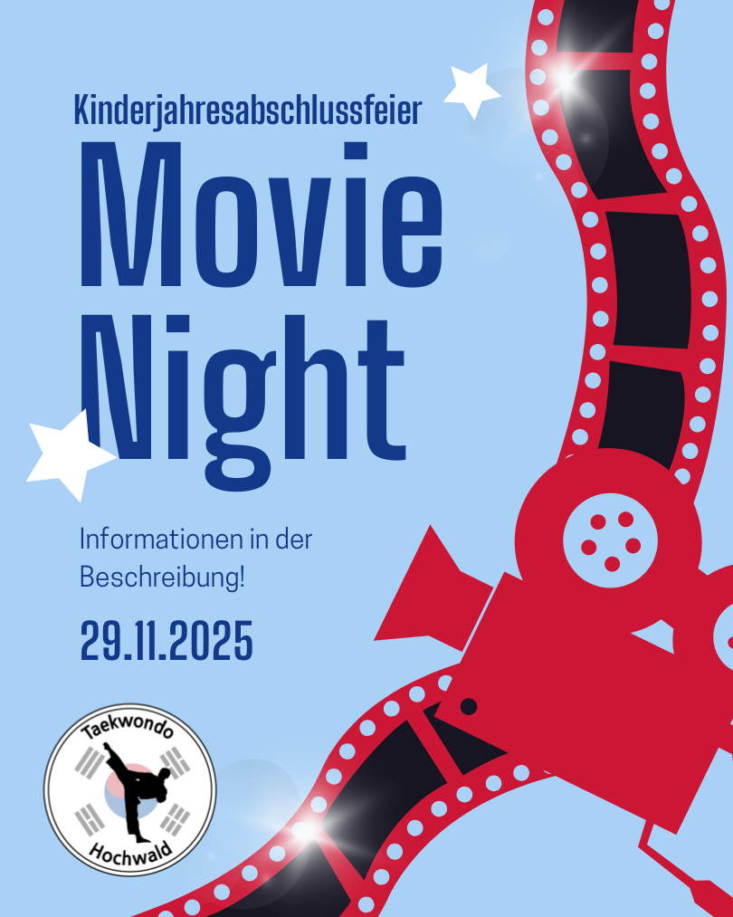 Liebe Mitglieder und Freunde des Taekwondo Hochwald e.V., am 29.11.25 findet unsere diesjährige Kinderjahresabschlussfeier statt. Wir treffen uns im Kino „Lichtspiele Wadern“, um gemeinsam einen Film zu schauen. Die Information zur Anmeldung findet ihr in der WhatsApp-Infogruppe oder auf Anfrage beim Vorstand. Wir freuen uns auf euch! Liebe Grüße Euer Taekwondo Hochwald e.V.